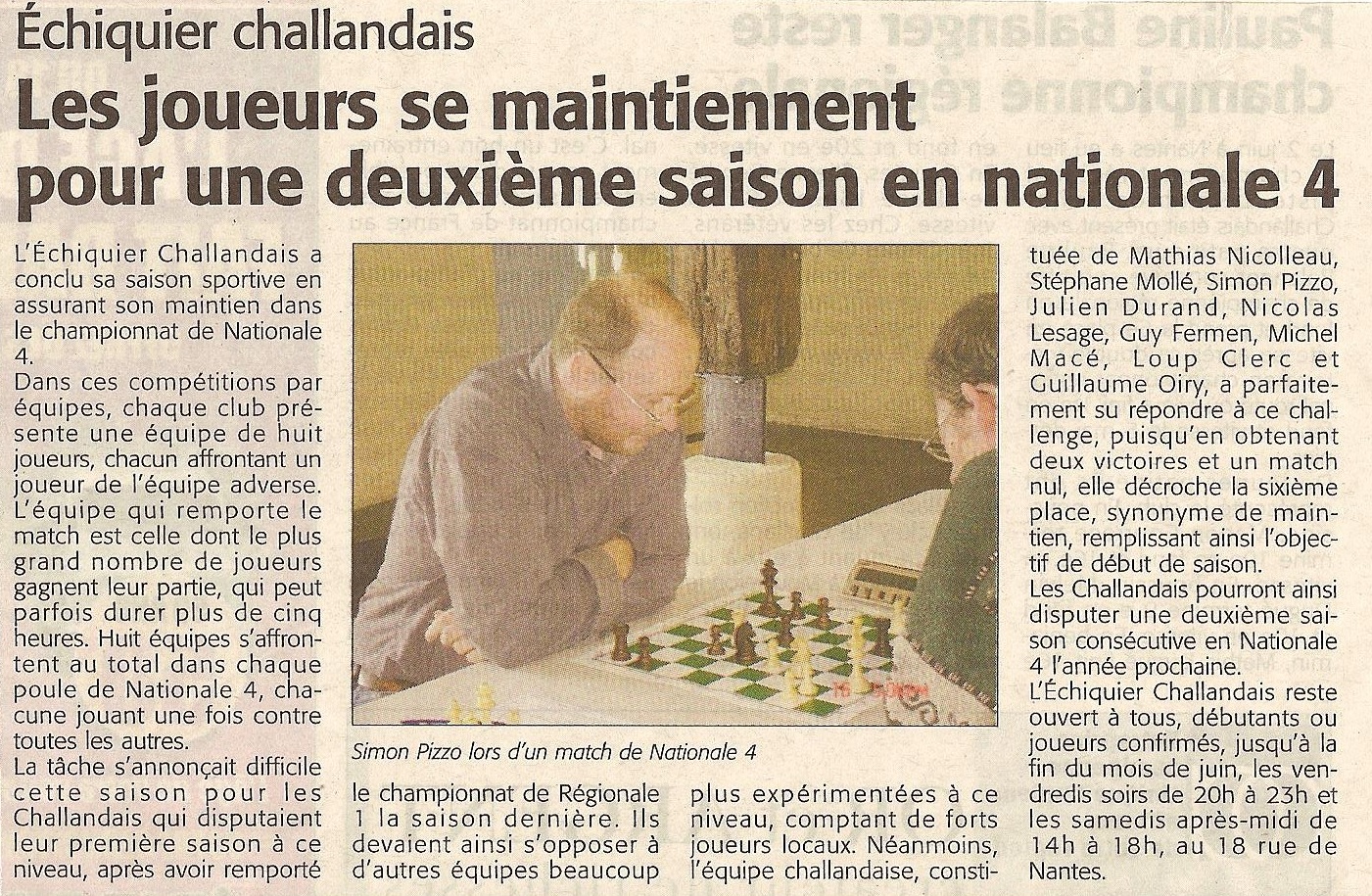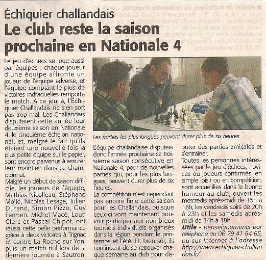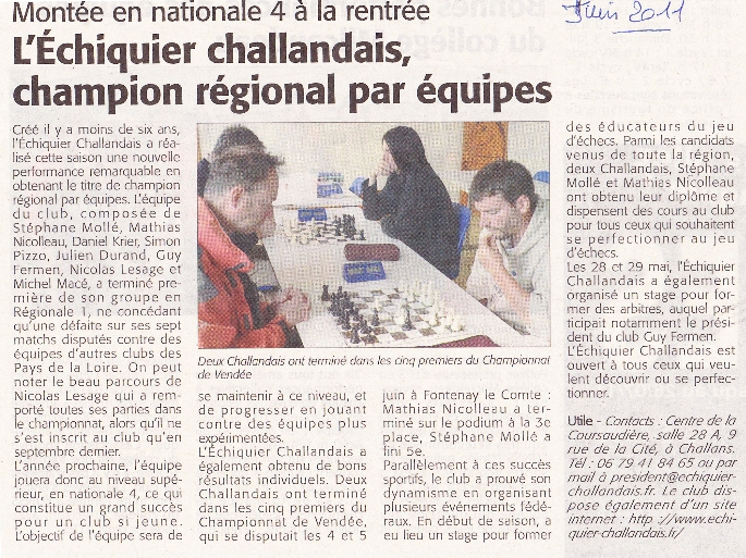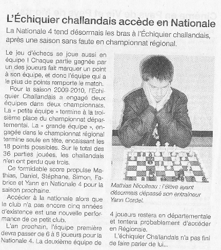 Ouest France, 13 mai 2010 : L'Echiquier Challandais, champion de Régionale 1