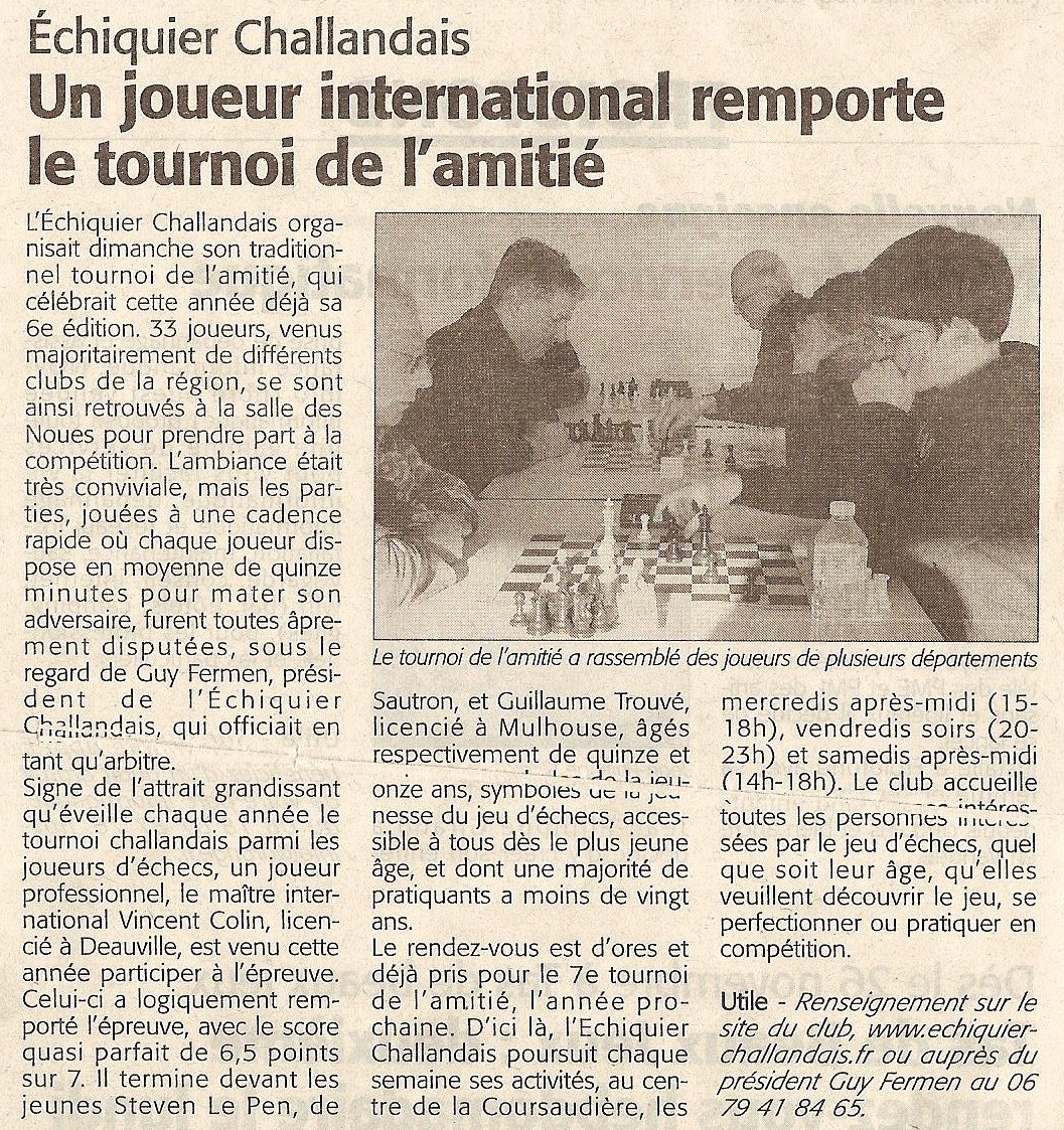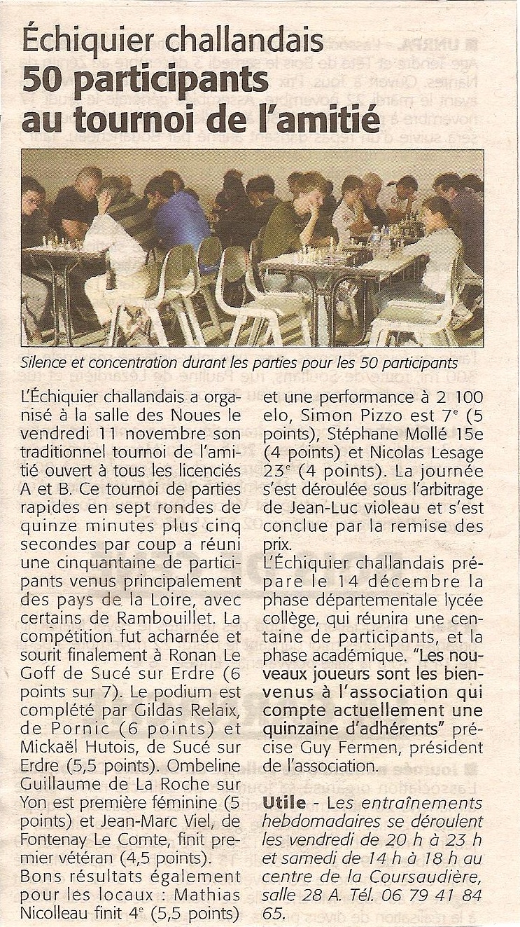 Le 11 novembre, l'Échiquier challandais a organisé son tournoi annuel de l'amitié. Cinquante licenciés étaient inscrits rassemblant les clubs des Pays de Loire. Un tournoi de parties rapides de 15 minutes et de 5 secondes par coup. Un tournoi homologué, organisé par Guy Fermen, le président du club qui détaille les projets : « Un tournoi départemental collèges-lycées et un autre au niveau académique ». Les nouveaux joueurs sont les bienvenus, les entraînements se déroulent à la Coursaudière.