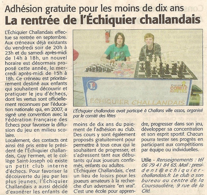 Le Courrier Vendéen, 11 octobre 2012 : La rentrée de l'Echiquier Challandais